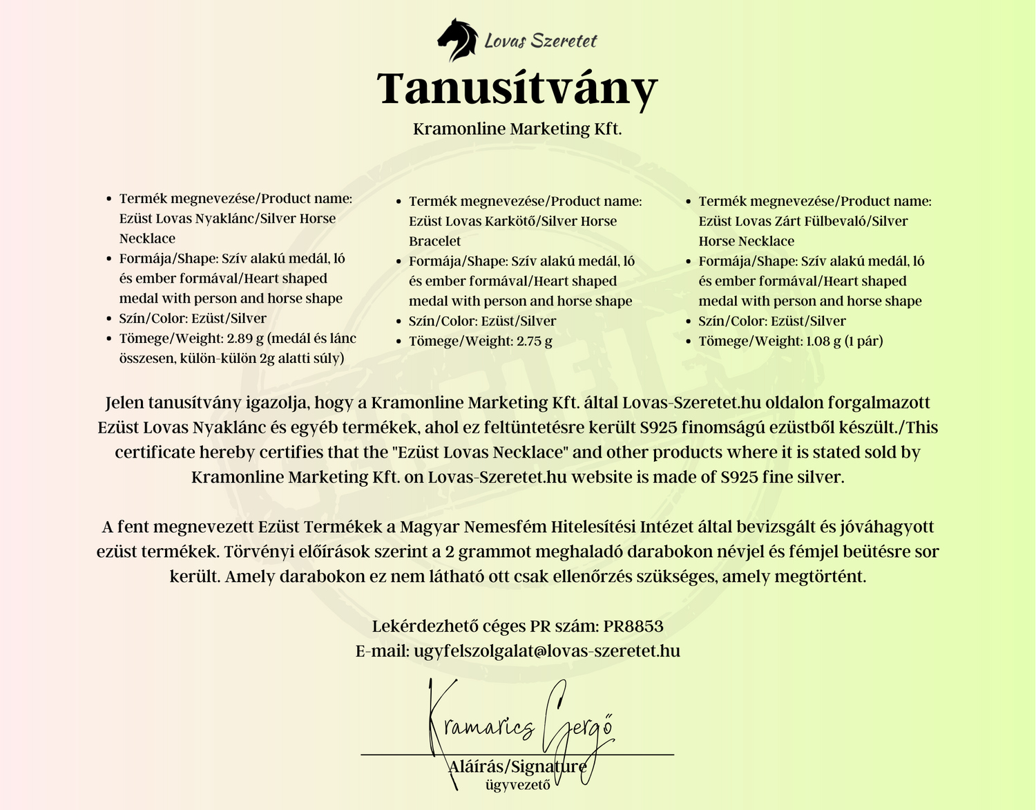 Biztosítunk, hogy amely termékeknél ez feltüntetésre kerül, ott valódi ezüstből készül a lehető legnagyobb odafigyeléssel és precizitással. Emellett a Magyar Nemesfém Hitelesítési Intézet (NEHITI) által bevizsgálásra kerülnek az ékszerek és, ahol szükséges fémjel és névjel is kerül beütésre.